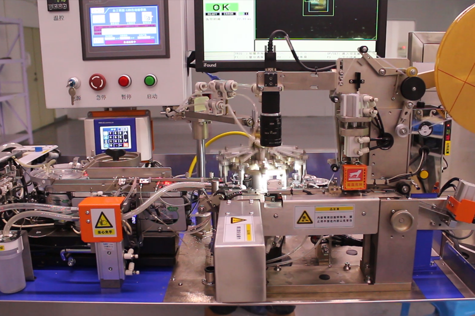 7.分光:在抽測(cè)完成后,整批LED成品將會(huì)進(jìn)行分光計(jì)篩選,由圓形振動(dòng)盤與平行振動(dòng)軌道負(fù)責(zé)送料,吸咀將LED燈送至轉(zhuǎn)盤,經(jīng)由測(cè)試站測(cè)量光電特征,根據(jù)LED燈珠的電壓、漏電值、波長(zhǎng)等參數(shù)區(qū)分開來,分成不同的BIN檔,再通過分料機(jī)構(gòu)將LED燈送至所屬落料盒。