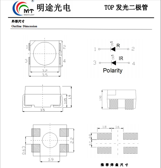 本系列產(chǎn)品體積3.5*2.8 厚度有1.9mm 色彩多樣,適用于無鉛回流焊,環(huán)保產(chǎn)品,符合歐盟公布的ROSH指令要求本系列產(chǎn)品主要用于美容儀器、遙控器等。3528紅紅外雙色LED燈珠 MT-L3528QRHIRC